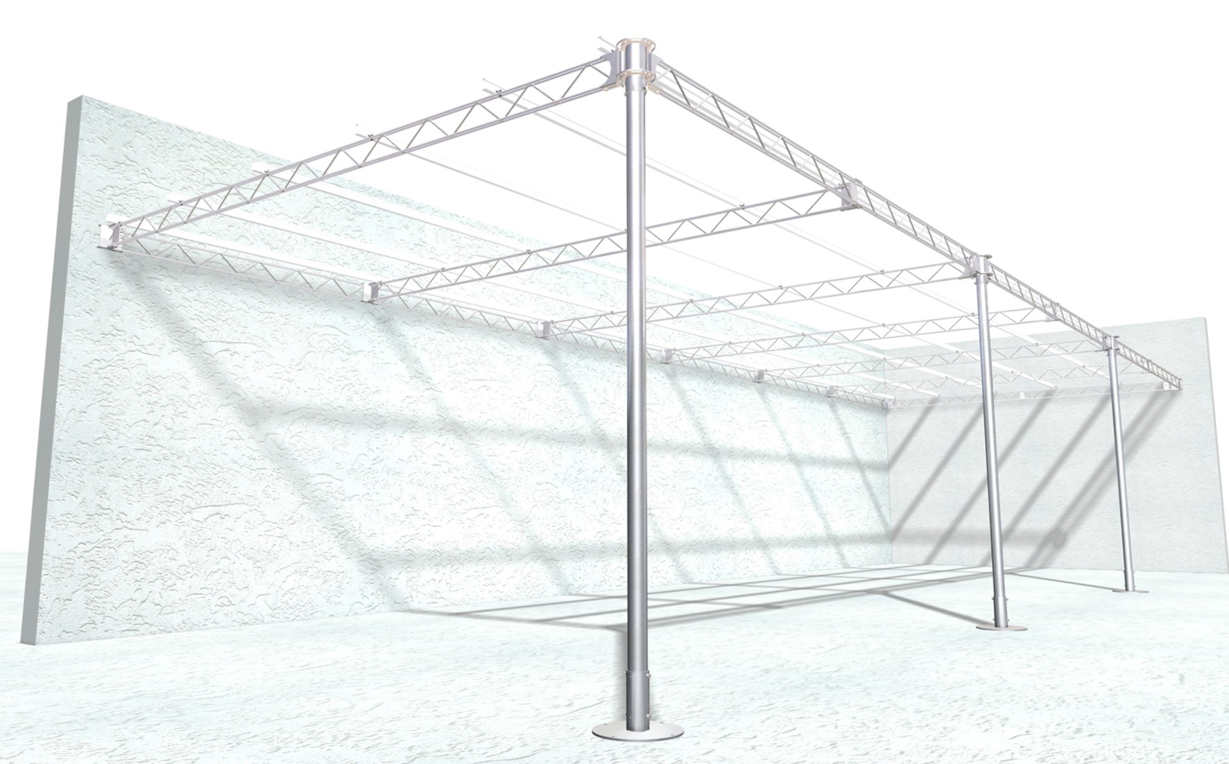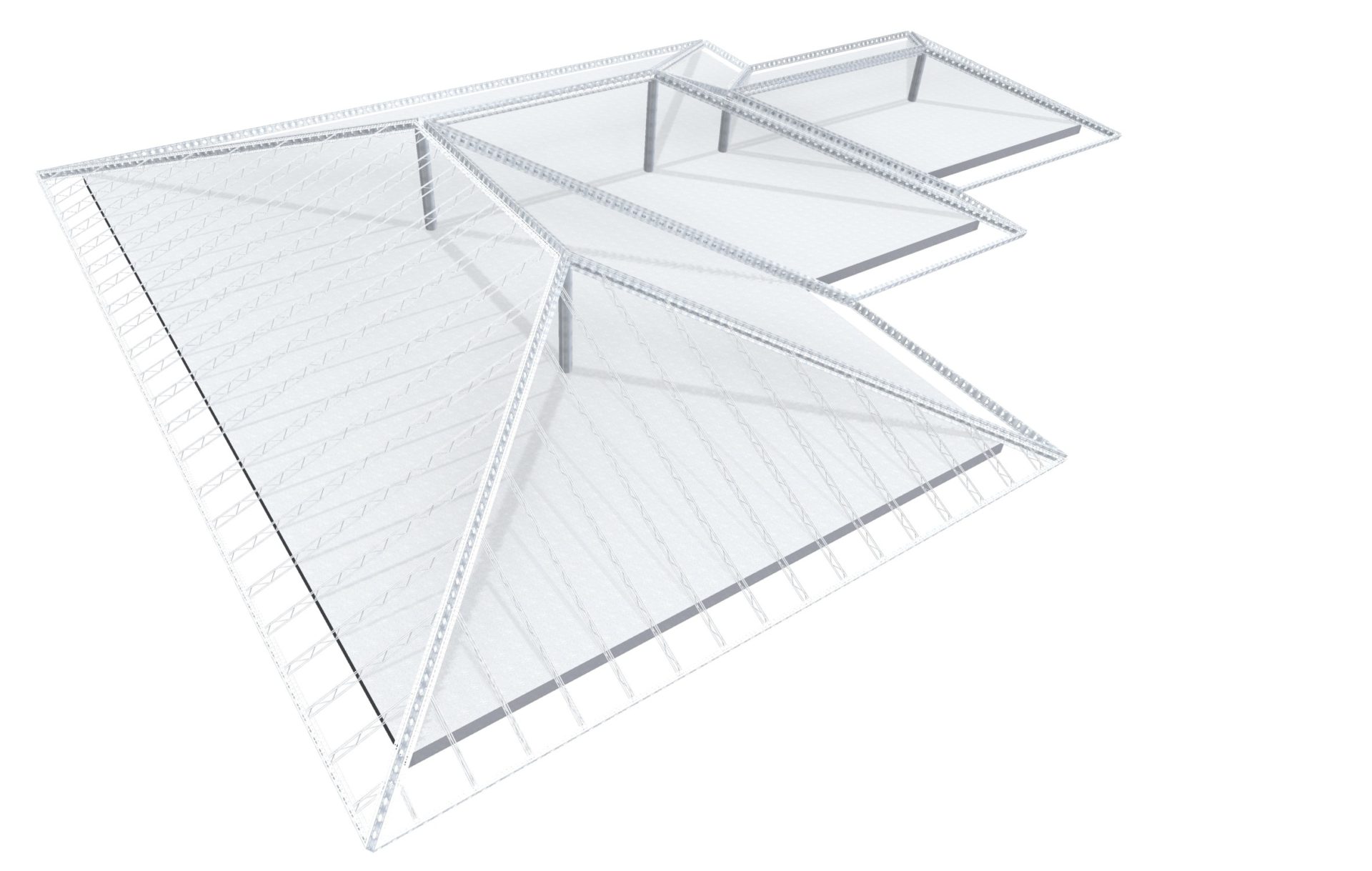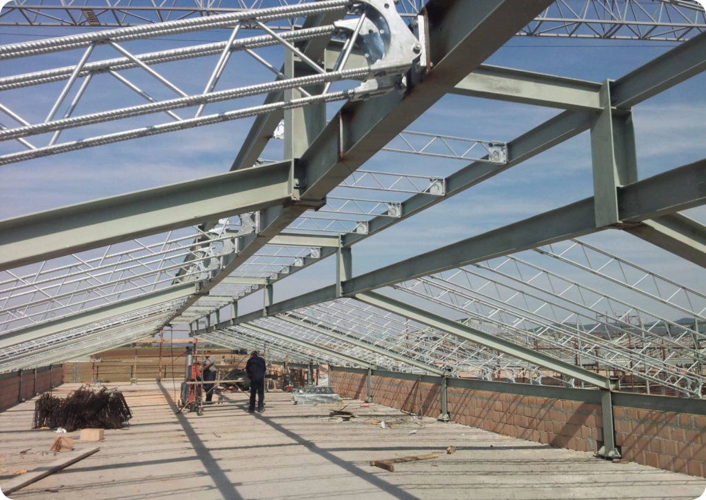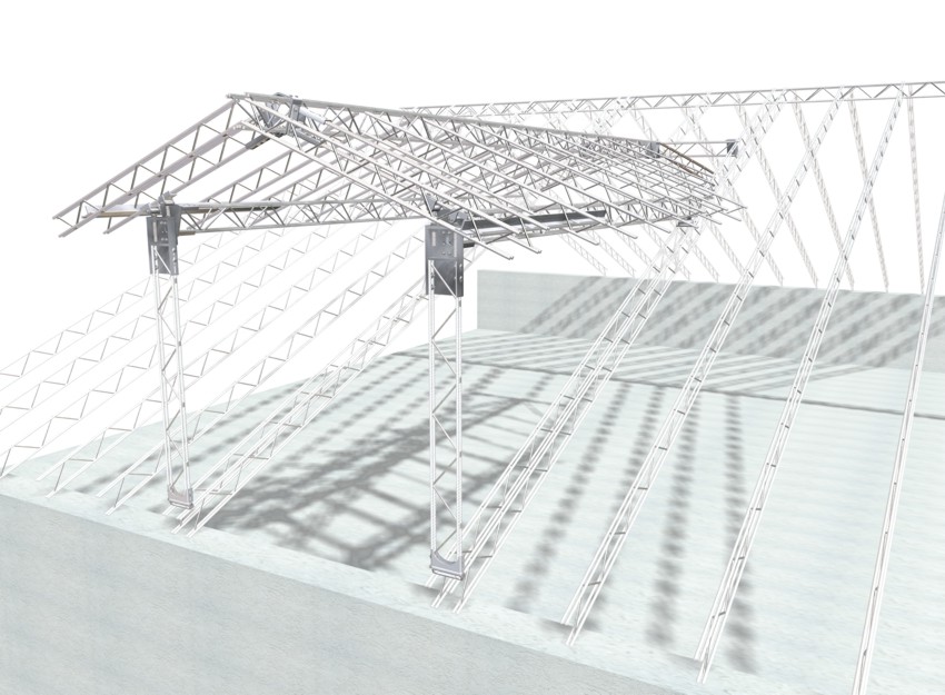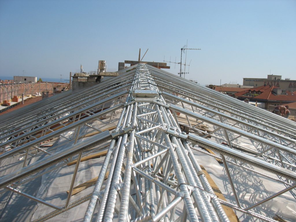 Strutture tralicciate in acciaio zincato a caldo abbinate a kit pronti per la realizzazione di tettoie, gazebi e coperture in genere.