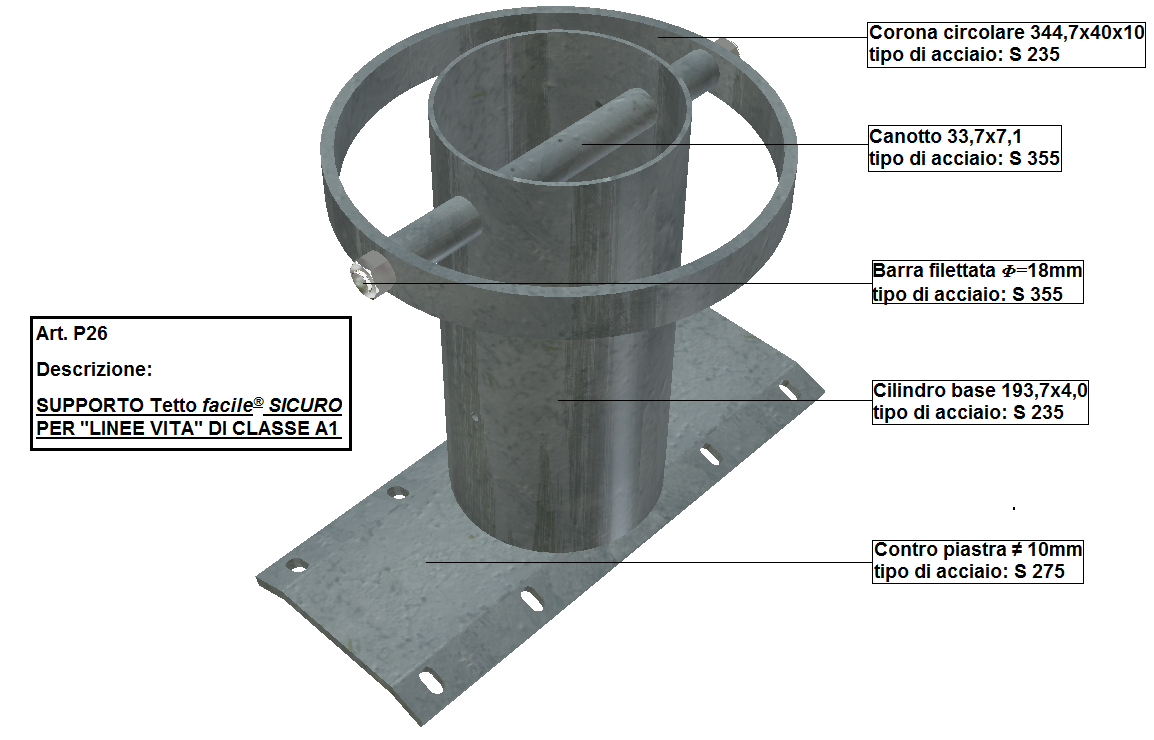 Il supporto che noi forniamo è costituito da una contro piastra, dove è sovrapposto il cilindro base con i canotti di collegamento, corona circolare e barra filettata, in cui trovano alloggiamento i bulloni per il fissaggio del dispositivo anticaduta al traliccio di colmo; il sistema resistente “contro piastra-struttura tralicciata” fa si che le sollecitazioni indotte dal carico di progetto, vengano distribuite su di un tratto adeguato del traliccio di colmo e sui tralicci di falda a tergo collegati al perimetro di attacco della piastra diminuendone l’intensità come ben evidenziato dalla simulazione numerica.